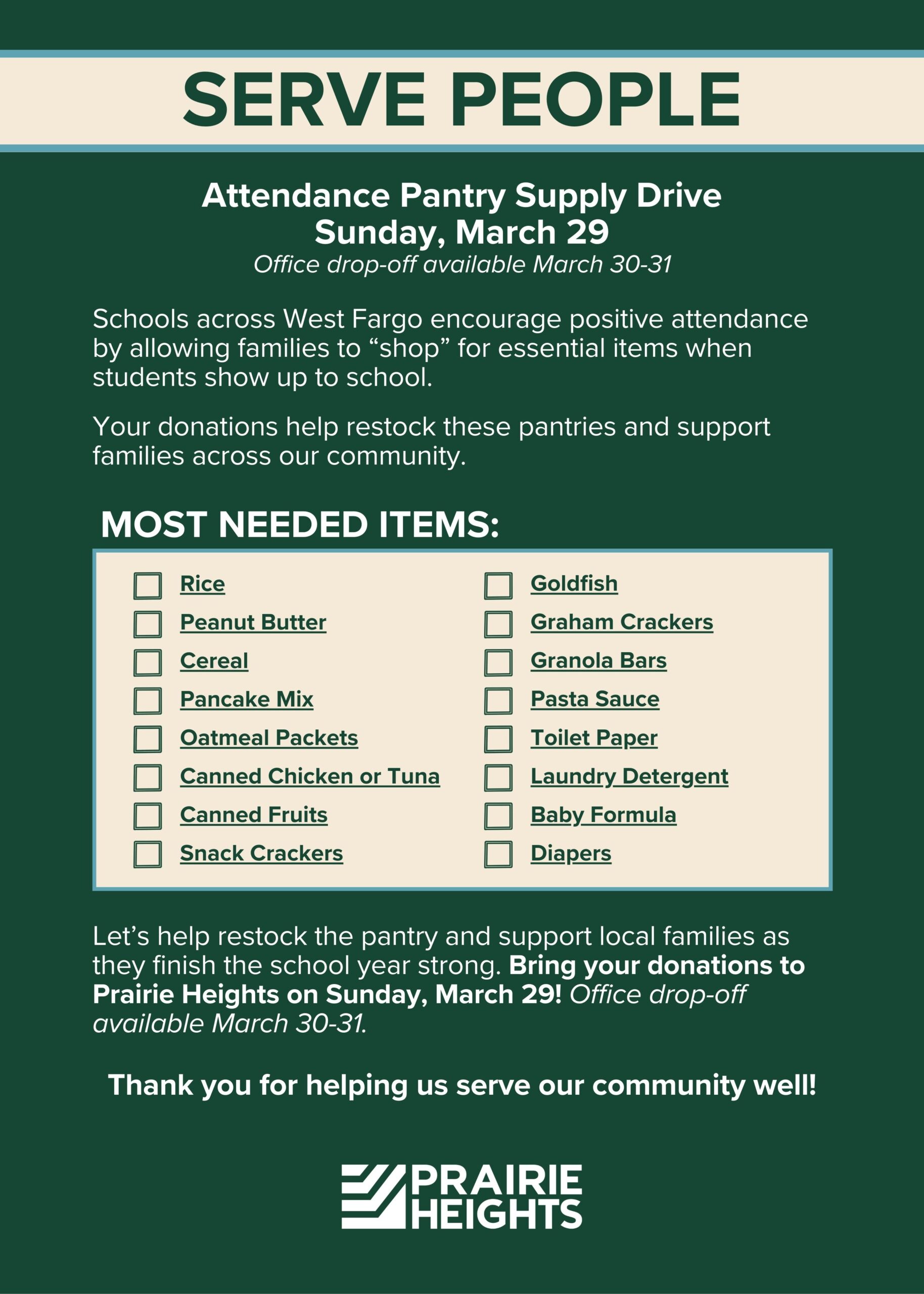 Prairie Heights is collecting donations of household goods, baby supplies, and shelf-stable food to help restock these pantries and serve families across our community.